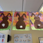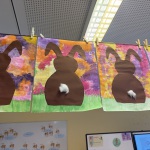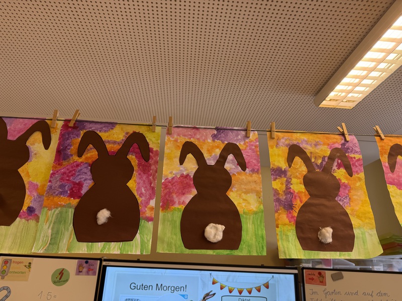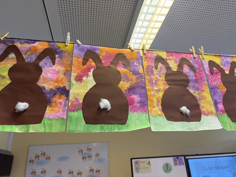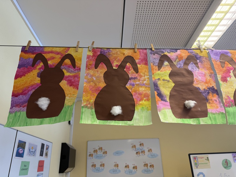 In unserem Klassenzimmer zieht der Frühling ein. Wir malen mit Frühlingsfarben einen Hintergrund und ein Osterhase darf darauf im Gras sitzen...